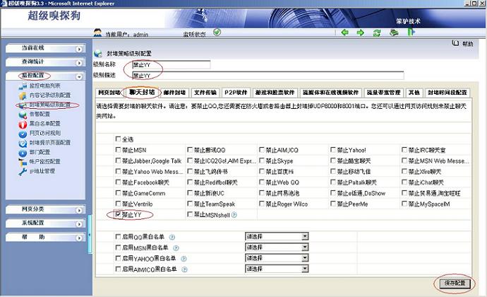 (2)打開超級嗅探狗,在“監(jiān)控配置-- >封堵策略級別配置-- >編輯-- >禁止YY”,配置如下如所示: