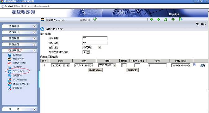 (1) 在“系統(tǒng)配置->自定義協(xié)議”中點擊“ 新增自定義協(xié)議”增加一個自定義協(xié)議,命名為YY,協(xié)議類型選擇“聊天軟件”,如下圖所示: