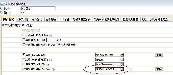 1. 在封堵級(jí)別中,要啟用“封堵提示頁面”,并且選擇一個(gè)提示頁面。