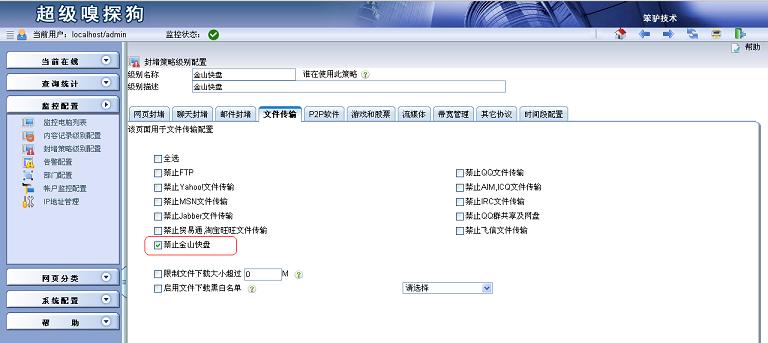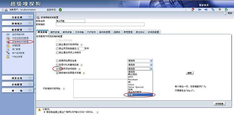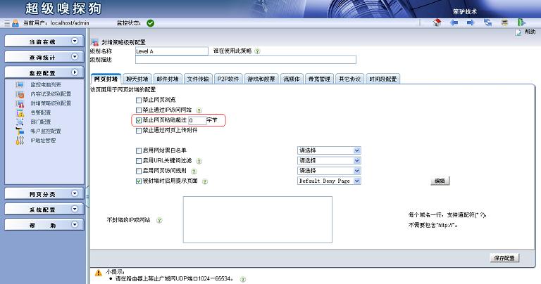 超級(jí)嗅探狗自帶網(wǎng)址庫(kù),可以根據(jù)禁止網(wǎng)頁(yè)分類“網(wǎng)盤與文件共享”來(lái)禁止網(wǎng)盤類的相關(guān)網(wǎng)站,但是有些網(wǎng)盤客戶端軟件不能禁止掉。 1.在“監(jiān)控配置”->“封堵策略級(jí)別配置”中添加一個(gè)封堵級(jí)別,選擇“啟用網(wǎng)頁(yè)訪問(wèn)規(guī)則”并新增一條規(guī)則。方法三:新建自定義協(xié)議