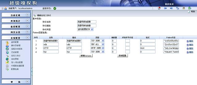 1)類型:TCP SEND 格式:0 Patten內(nèi)容:^\x10\x00\x00\x00\xe5\xd9\x27\x4c 2)類型:UDP ALL 格式:0 Patten內(nèi)容:^[\x12\x13]\x27\x00\x00[\x00-\xff]{3}\x00$ 3)類型:HTTP SEND 格式:Host Patten內(nèi)容:.*jsq\.(xunlei|gigaget)\.com 4)類型:TCP SEND 格式:0 Patten內(nèi)容:.*request.*userid.*peerid.* 其他相關(guān)信息可隨意填寫,但要注意Patten內(nèi)容一定不能書寫錯誤。最后保存配置。3.添加相應(yīng)的封堵策略