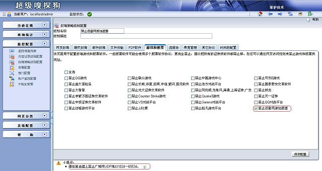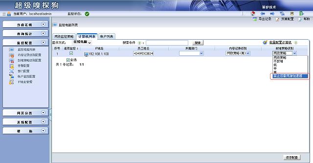 進(jìn)入監(jiān)控配置 -> 監(jiān)控電腦列表。對需要禁止的電腦進(jìn)行配置,選擇“封堵策略級別”為“禁止迅雷網(wǎng)游加速器”,最后保存配置并應(yīng)用新配置。這時迅雷網(wǎng)游加速器就無法為任何網(wǎng)游加速了,也就代表該軟件已經(jīng)被封堵成功。再把想要封堵的網(wǎng)游加入到封堵策略就可以了。