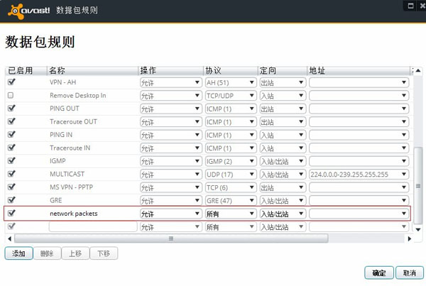 3. 增加一條新的數(shù)據(jù)包規(guī)則:取一個(gè)名稱,允許所有的協(xié)議通過,保存配置。