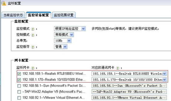 1). 在“監(jiān)聽配置->監(jiān)控設(shè)備配置”中選擇相對(duì)應(yīng)的兩塊監(jiān)聽網(wǎng)卡,保存配置。每塊網(wǎng)卡都接到對(duì)應(yīng)局域網(wǎng)的鏡像端口。