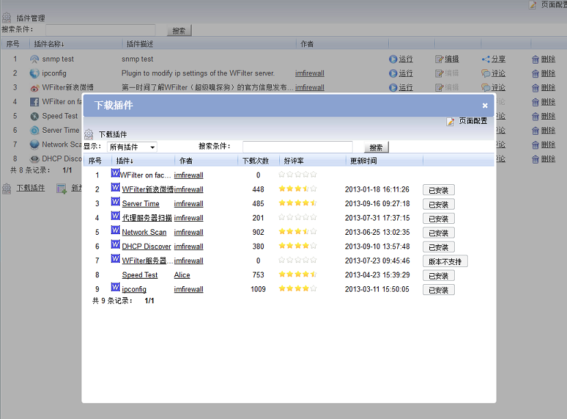 該插件系統(tǒng)提供了網(wǎng)絡管理、上網(wǎng)行為管理的一系列插件,如:網(wǎng)絡掃描、代理服務器掃描、DHCP掃描、WFilter服務器管理等多種插件。而且插件還在不斷的豐富中,您也可以開發(fā)自己需要的插件。