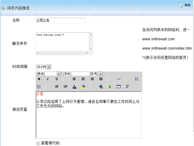 該功能可以指定條件給客戶機推送web頁面,可以用于企業(yè)公告、內(nèi)容推送、報表推送等功能的實現(xiàn)。