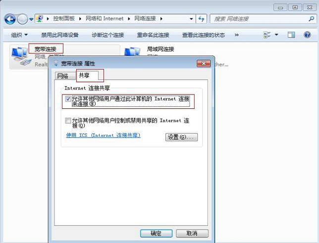 進(jìn)入“控制面板”->“網(wǎng)絡(luò)和Internet”->“網(wǎng)絡(luò)連接”,右鍵單擊接Internet那塊網(wǎng)卡的屬性(本例中是“寬帶連接”),單擊共享選項(xiàng)卡,將“允許其他用戶通過此計算機(jī)的Internet來連接”的復(fù)選框勾選上,如下圖。
