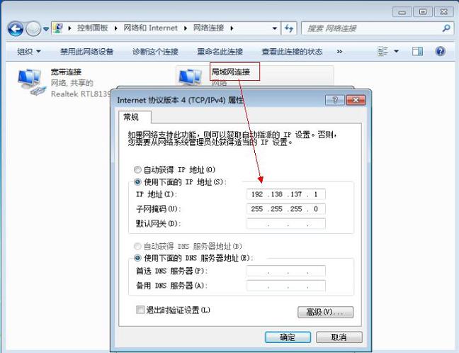 上述設(shè)置完成之后,“局域網(wǎng)連接”會獲得一個新的靜態(tài)IP地址和配置,在win7上,獲取結(jié)果如圖: