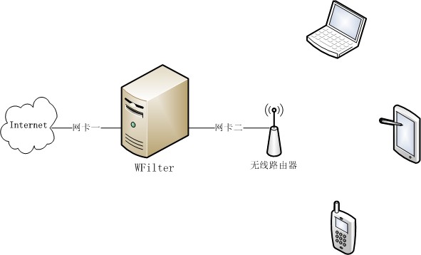 有些小型局域網(wǎng)只通過一個無線路由器接入,而且沒有支持鏡像的交換機(jī)或者路由器。這樣的情況下,可以采用本文中演示的方案:“把安裝WFilter的電腦配置為網(wǎng)關(guān),然后把無線路由器當(dāng)成無線AP來提供無線服務(wù)”。