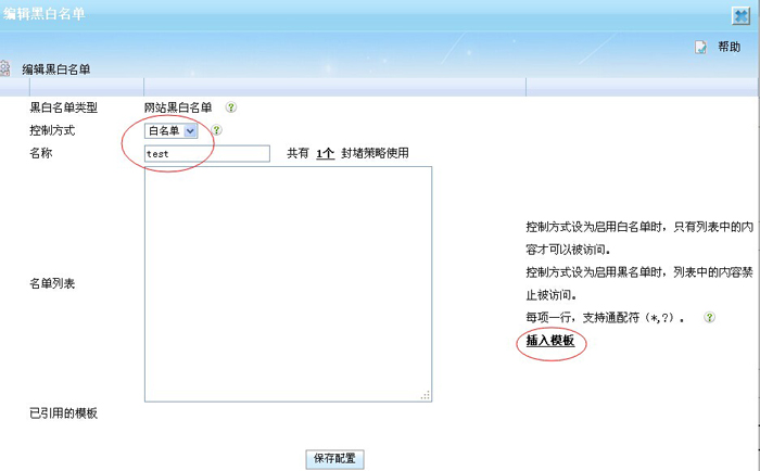 1.新增test策略,新增一個(gè)網(wǎng)站黑白名單test。