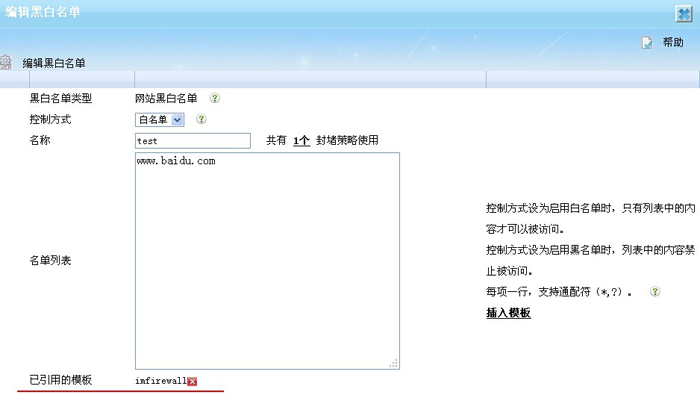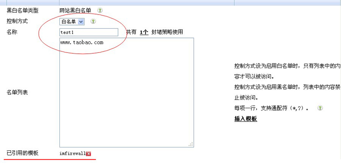 4.再新增一個(gè)test1策略,新增一個(gè)網(wǎng)站黑白名單test1,并引用已經(jīng)建好的模板imfirewall。