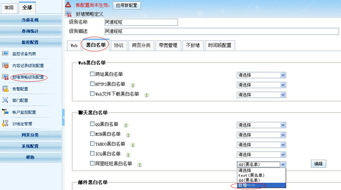 1.在“封堵級(jí)別策略“中新增一個(gè)“阿里旺旺”策略