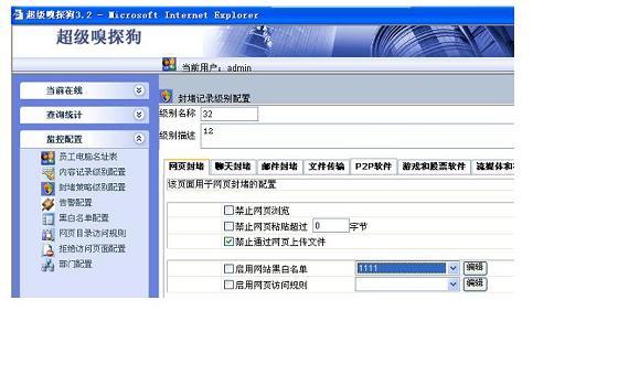 如果只是要禁止網(wǎng)頁上傳,只需選擇“封堵級別策略配置”,然后選擇“網(wǎng)頁封堵”