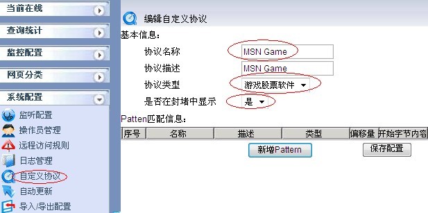 2.1 在“系統(tǒng)配置->自定義協(xié)議”中點(diǎn)擊“ 新增自定義協(xié)議”增加一個(gè)自定義協(xié)議,命名為MSN Games,協(xié)議類型選擇“游戲股票軟件”,如下圖所示: