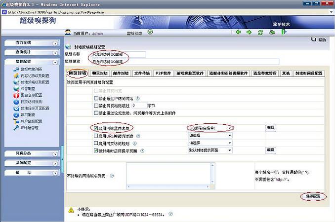 1.打開超級嗅探狗“監(jiān)控配置-- >封堵策略級別配置-- >新增封堵級別”,具體配置如下圖所示: