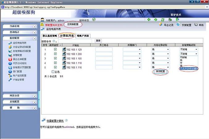 3.在“監(jiān)控配置-- >監(jiān)控電腦列表”中應用封堵策略,如下圖所示: