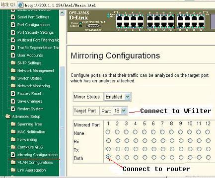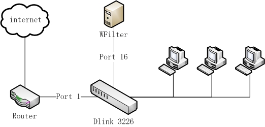 As in the diagram above, port 16 is connected with the router and port 1 is connected to the computer with WFilter installed on.