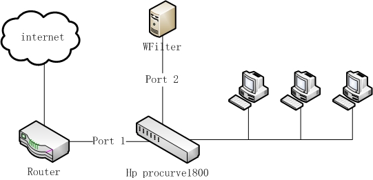 In this network, we only need to do port mirroring in the hp procurve 1800 switch to do monitoring and filtering.
