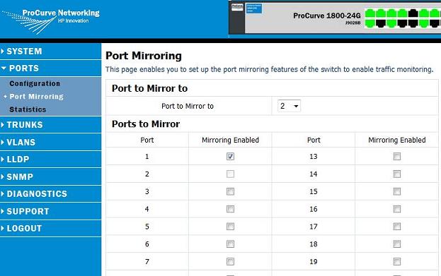 The below diagram shows the mirroring settings of the hp procurve switch: