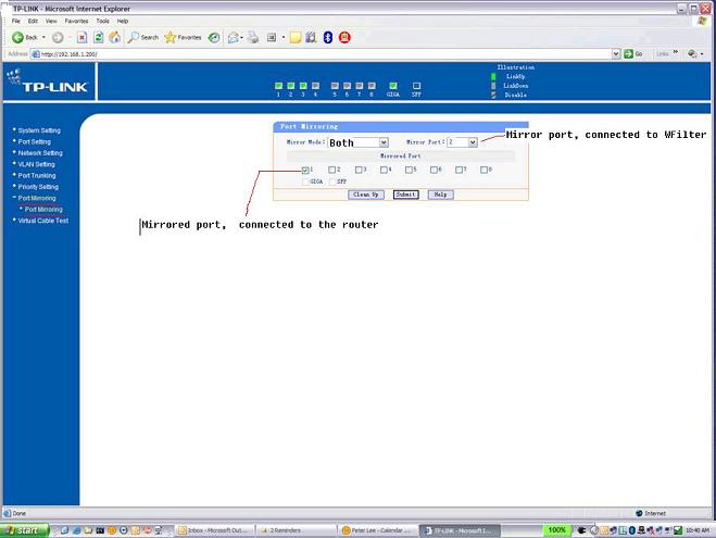 Port1 of the manageable switch is connected to the router, port2 is connected to WFilter computer and port3 is connected to the wireless Access Point.