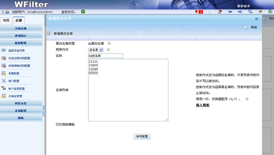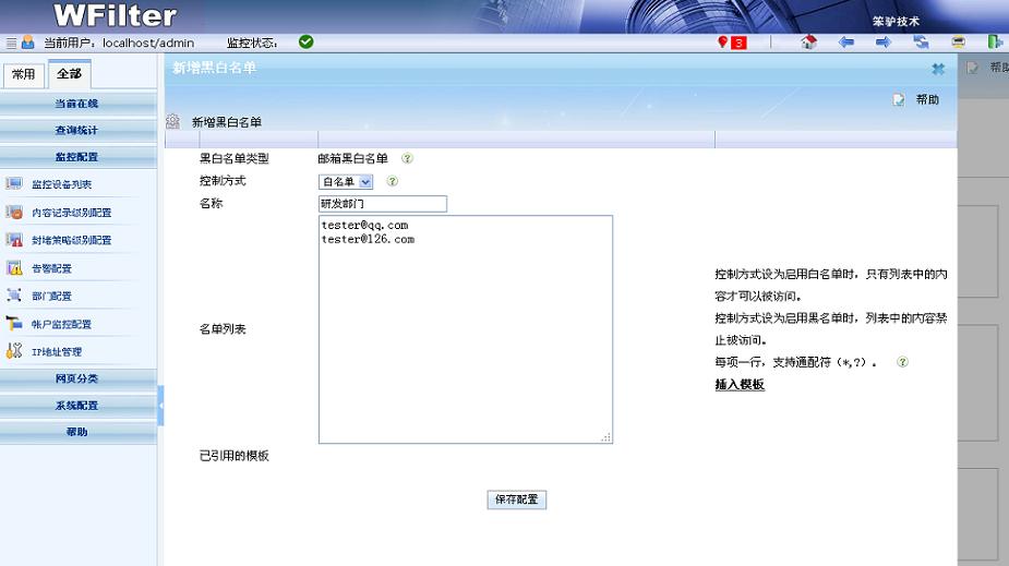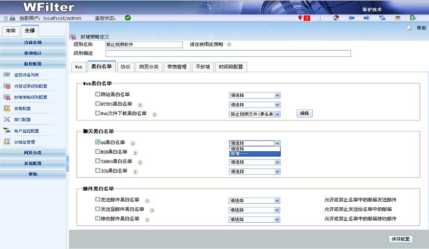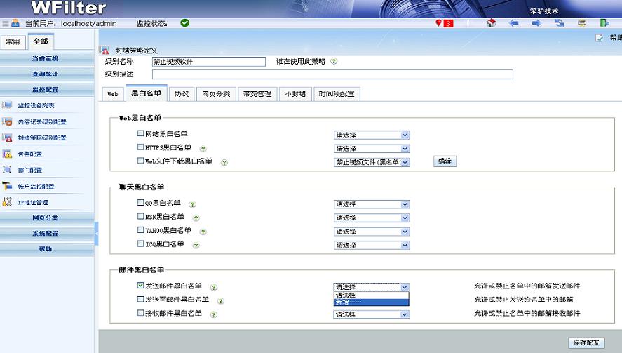 - 支持網(wǎng)頁黑白名單、聊天ID黑白名單、郵件黑白名單、下載黑白名單等多種黑白名單。