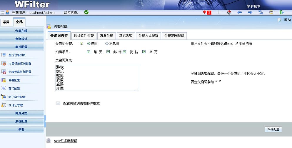 - 為郵件、發(fā)帖、網頁內容等設置關鍵詞告警。